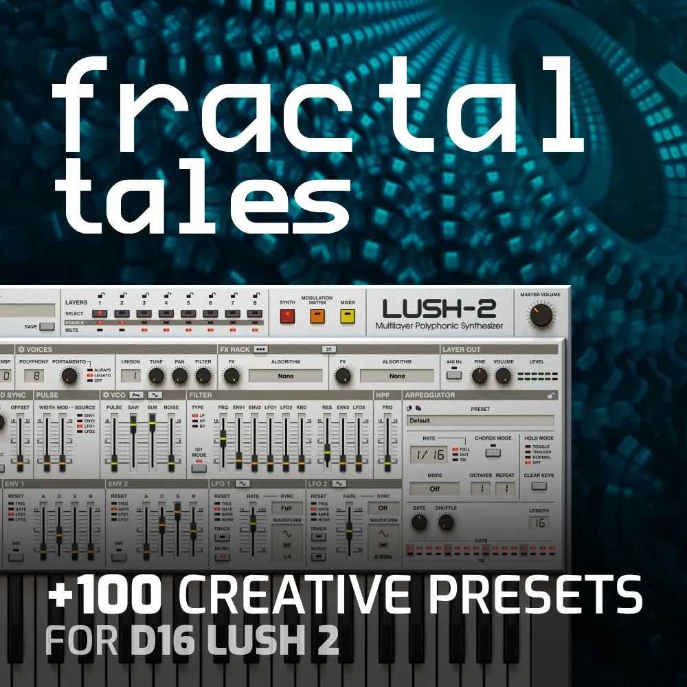 Fractal Tales is a collection of over 100 presets for D16 Lush 2 synthesizer, featuring a diverse arrangement of retro and modern sounds with a trance state of mind.