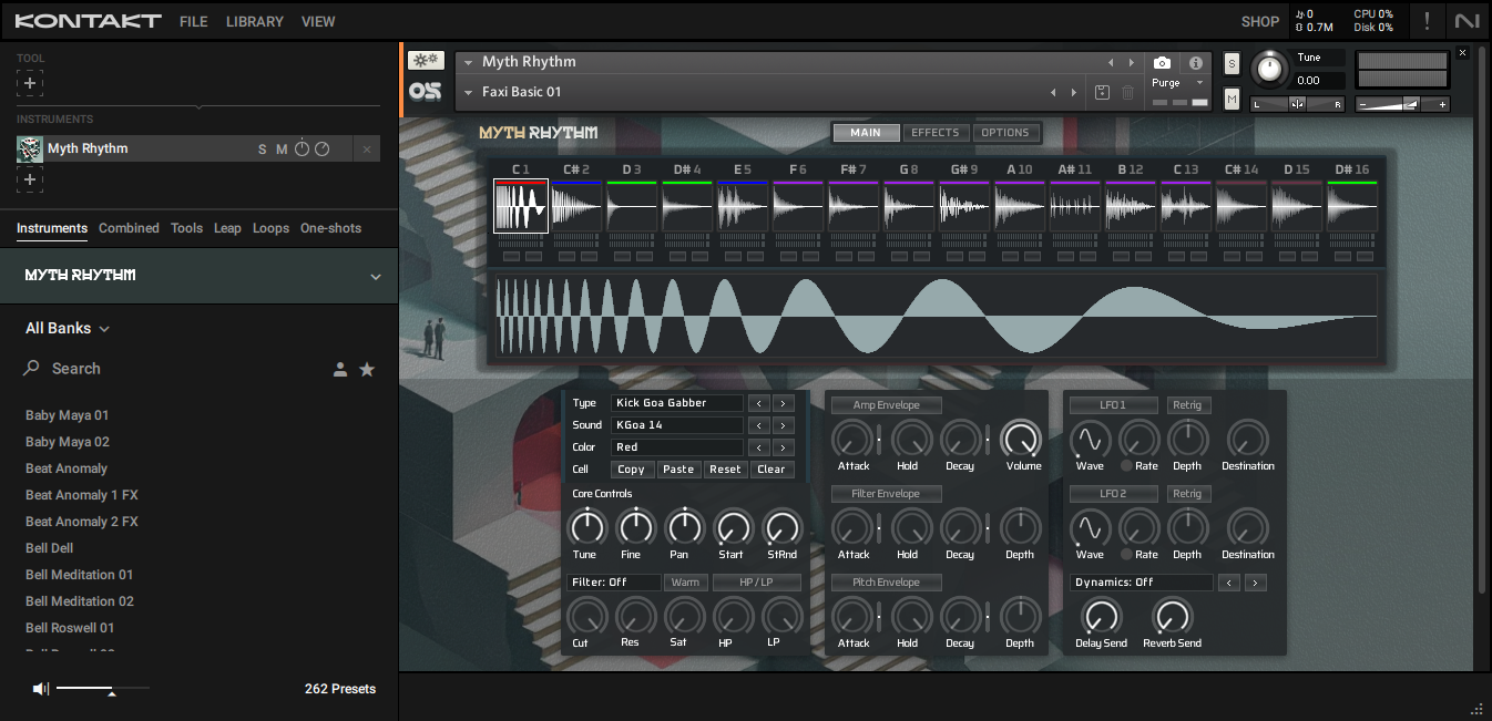 Myth Rhythm is a versatile cell based instrument featuring 16 individual cells, each capable of holding one of over 4,800 included samples or a user-loaded sample.