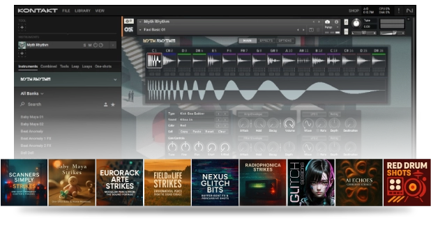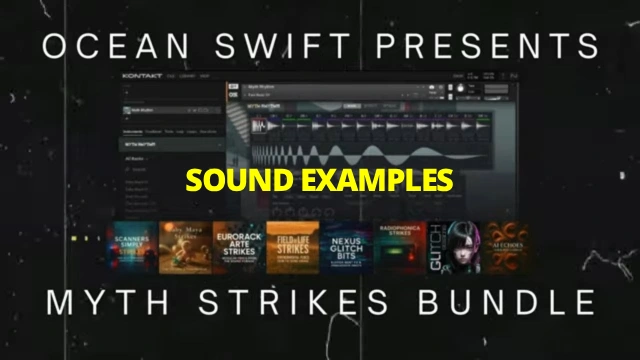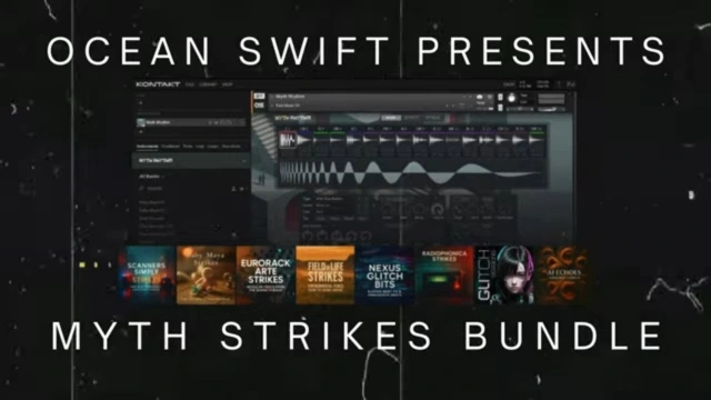 Myth Rhythm Kontakt Instrument, Eurorack Arte Strikes, Field of Life Strikes, Nexus Glitch Bits, Radiophonica Strikes, Scanners Simply Strikes, Baby Maya Strikes, AI Echoes Gibberish Strikes, Red Drum Shots, Glitch Sessions (Bonus) – Myth Rhythm + 9 curated sample packs in one bundle.